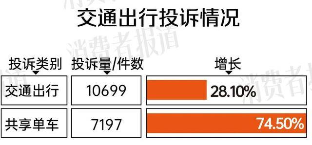 数据显示,2025年,上海市消保委系统共受理交通出行相关投诉10699件,同比增长28.1%,其中共享单车相关投诉7197件,同比激增74.5%,成为交通出行投诉的主要增长点。