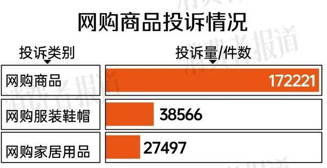 网购投诉是消费者投诉的重点,投诉量为172221件,同比增长34.8%。其中服装鞋帽、家居用品类的投诉量位居前列,分别为38566和27497件。