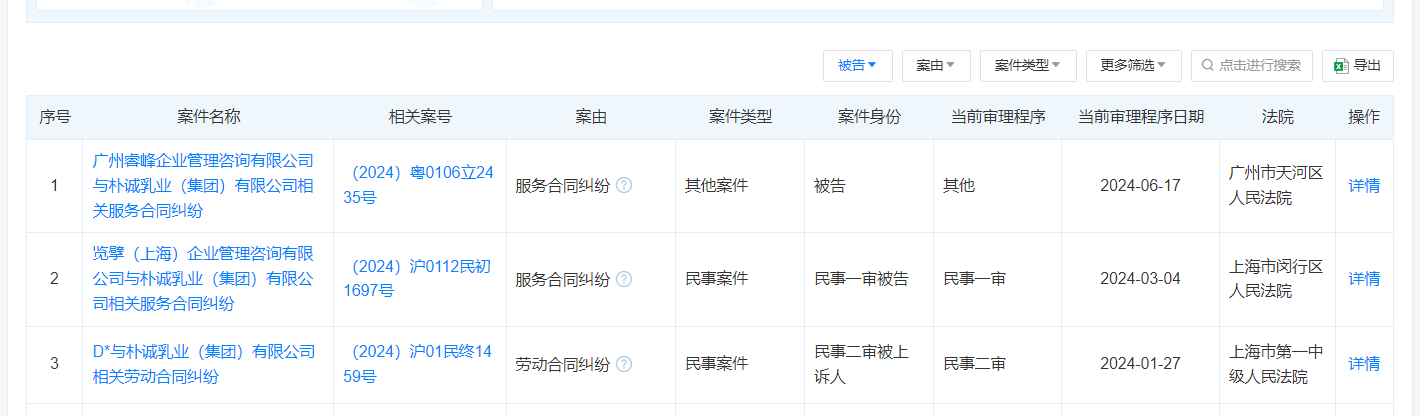 据金融界康养中心查询天眼查获悉,2024年朴诚乳业以被告身份涉案3起,案由以服务合同纠纷和劳动合同纠纷为主,涉案集中在广州、上海两地。