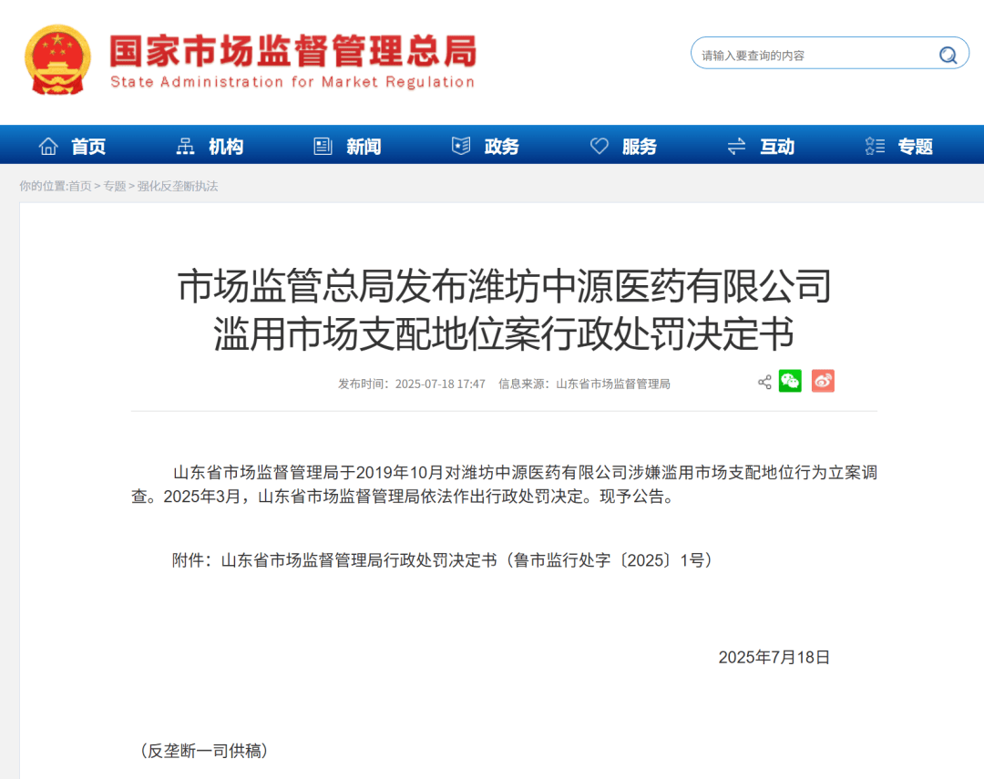 山东省市场监督管理局对潍坊中源医药有限公司涉嫌滥用市场支配地位行为进行处罚,罚没金额合计超过3765万元。