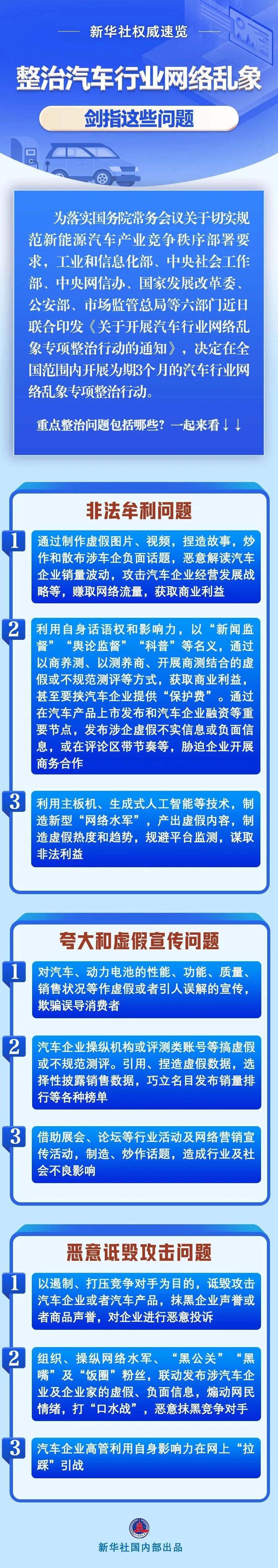 工业和信息化部、中央社会工作部、中央网信办、国家发展改革委、公安部、市场监管总局等六部门近日联合印发《关于开展汽车行业网络乱象专项整治行动的通知》,决定在全国范围内开展为期3个月的汽车行业网络乱象专项整治行动。