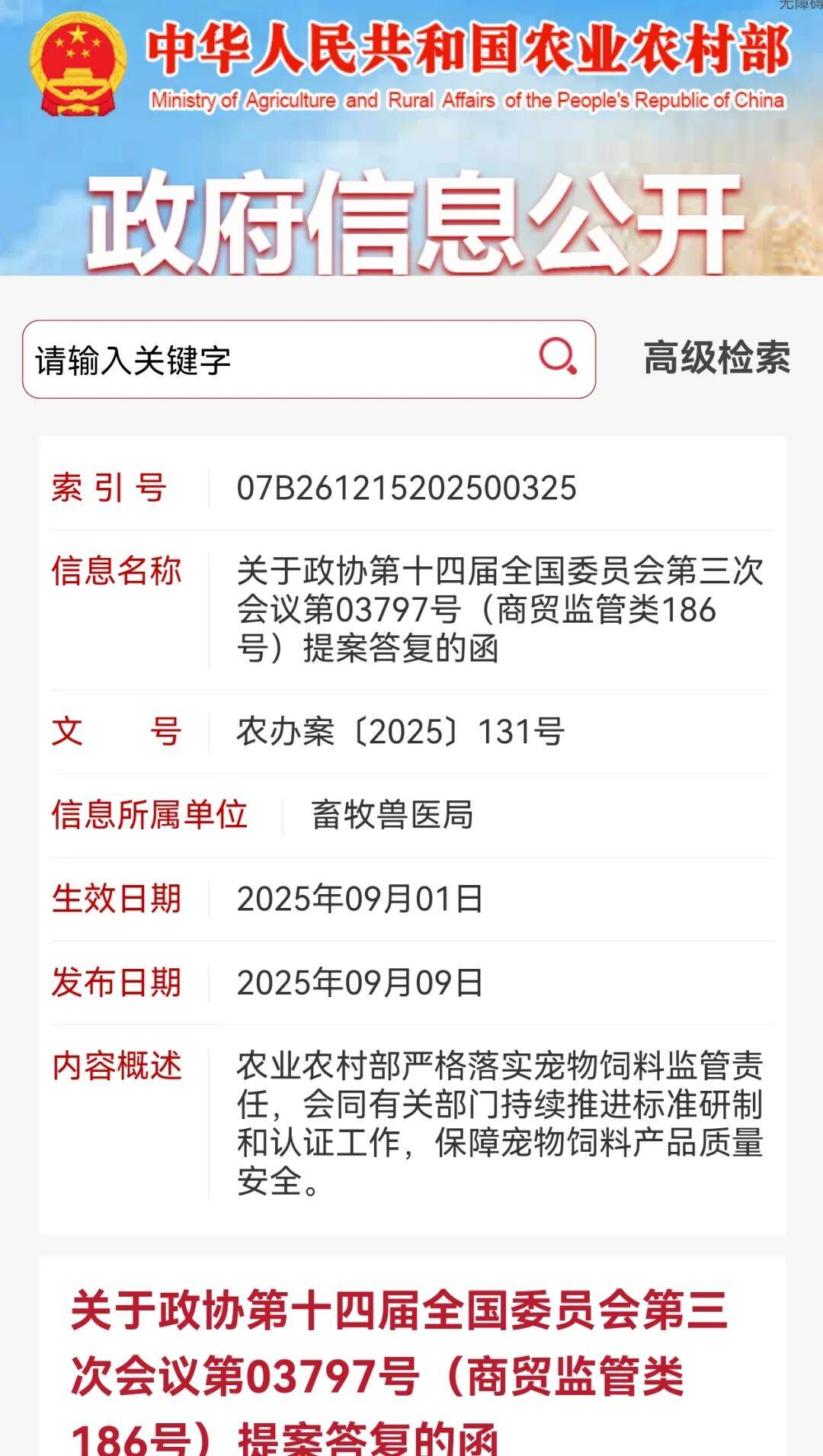 《饲料和饲料添加剂管理条例》(以下简称《条例》)规定,饲料是指经工业化加工、制作供动物食用的产品,饲料添加剂是指在饲料加工、制作、使用过程中添加的少量或者微量物质,国务院农业行政主管部门负责全国饲料、饲料添加剂的监督管理工作。农业农村部依据《条例》规定,制定发布了《宠物饲料管理办法》、《宠物饲料生产企业许可条件》、《宠物饲料标签规定》、《宠物饲料卫生规定》、《宠物配合饲料生产许可申报材料要求》、《宠物添加剂预混合饲料生产许可申报材料要求》等6个规范性文件,强化宠物饲料(即宠物食品)质量安全监管。目前,农业农村部建立了相对完善的管理制度体系,对境内宠物饲料生产企业实施生产许可制度,对境外宠物饲料产品向国内出口实施进口登记制度。同时,还将宠物饲料产品及其生产企业纳入饲料质量安全监管范围,每年开展宠物饲料产品的监督抽查、例行监测、风险预警等工作,抽取一定数量的宠物饲料生产企业开展现场检查。