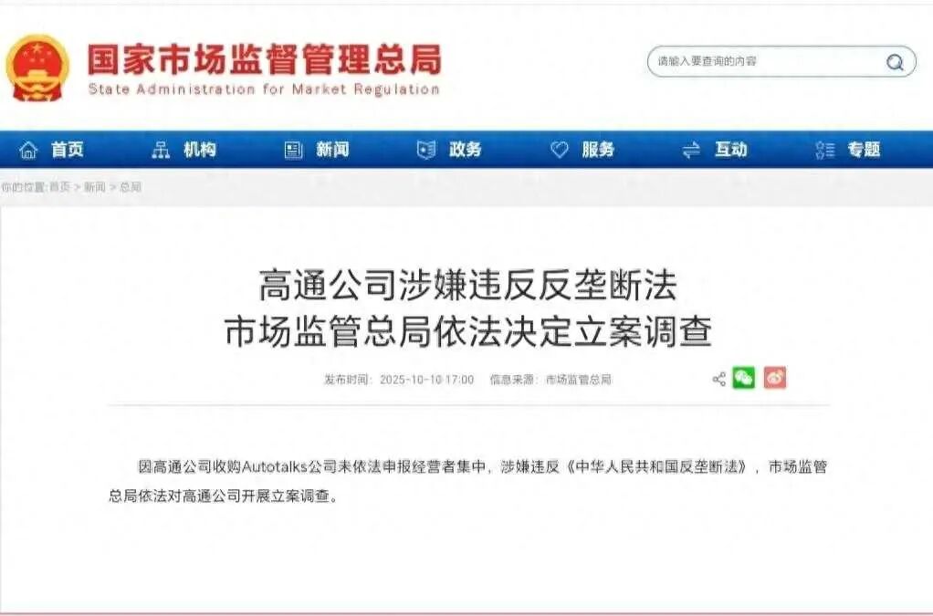 2025年10月10日,国家市场监督管理总局发布重磅公告:因高通公司收购以色列企业Autotalks未依法申报经营者集中,涉嫌违反《中华人民共和国反垄断法》,市场监管总局已依法对高通立案调查。