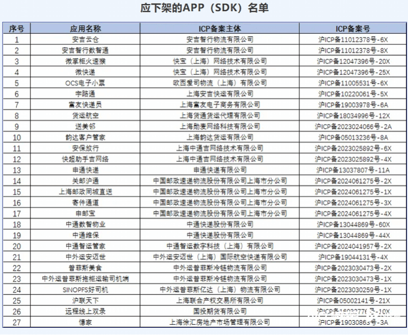 11月3日,上海市通信管理局通报下架27款侵害用户权益行为App(SDK),涉及“安吉云仓”“微快递”“OCS电子小票”“送美邻”“韵达客户管家”“安保放行”“快超助手吉网络”“申通快递”“关邮沪通”“上海邮政同城直送”“寄件通道”“申邮宝”“中通数智物业”“中通维保”“中通智运管家”“中外运安迈世”等。
