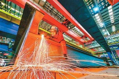 1月19日,在天津市滨海新区,海上油气平台建设工人进行气割作业。