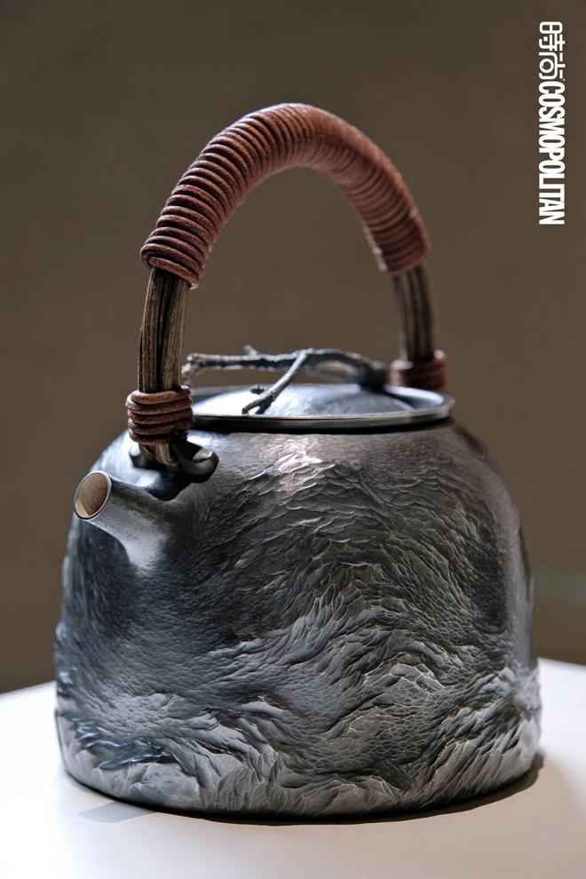 作品的创作周期,或长或短,因工艺与状态而异。有的壶他做了六年,也有的作品在“做爽了”的状态下,两三个月就完成,“我不喜欢赶工,即便是周期时间太长要亏本,也不要赶。”他的艺术轨迹,亦是一部自我进化史。早期《出山》《流》,打破对称造型,开启“不规则美学”;2016年起,《九峰雪霁》《秋山》等相继面世,银器从功能载体蜕变为情感与意境的寄托;再到《石开》《曹衣出水》,工艺炉火纯青,装饰性与精神性水乳交融。此后,他更踏入真正的当代探索阶段——“器物也拥有它的‘空间感’与‘黑白灰’。”
