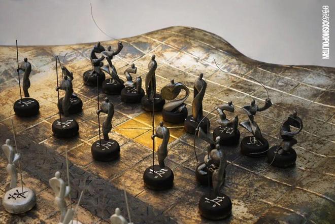 为国际品牌BURBERRY创作的艺术品《当局》,每一个棋子都是微型雕塑,将如项羽,披风战袍飞扬的将军;马借京剧扬鞭之势,动感破屏;炮取自汉代画像砖射箭图,古意盎然......“我想让西方人通过象棋,看见中国三千年的美学演化。”