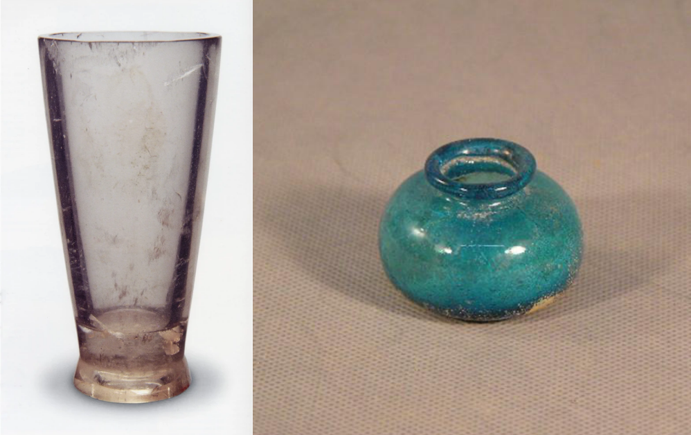 △左:战国水晶杯;右:北魏玻璃壶。