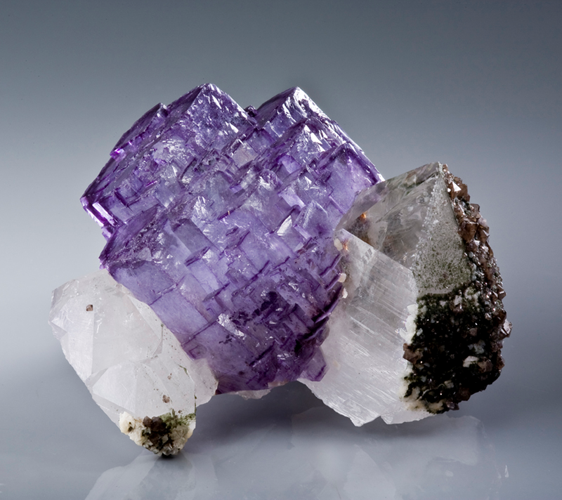 △不同颜色的萤石矿物,注意其形态和石英的差别