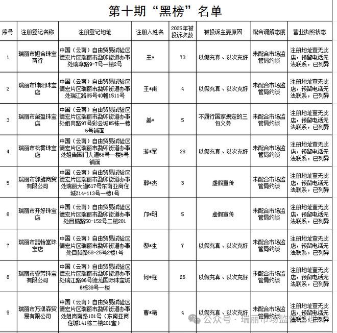 11月26日,云南省瑞丽市市场监管局公示9家被投诉次数较高,未配合解决投诉或通过注册地址和联系电话无法取得联系的珠宝翡翠直播商家。涉及:瑞丽市旭合珠宝商行、瑞丽市坤阳珠宝店、瑞丽市黛盈珠宝店、瑞丽市松雾珠宝店、瑞丽市郭旋商贸有限公司、瑞丽市开好珠宝店、瑞丽市翡怡堂珠宝店、瑞丽市睿芳珠宝有限公司、瑞丽市万濮森贸易有限公司。