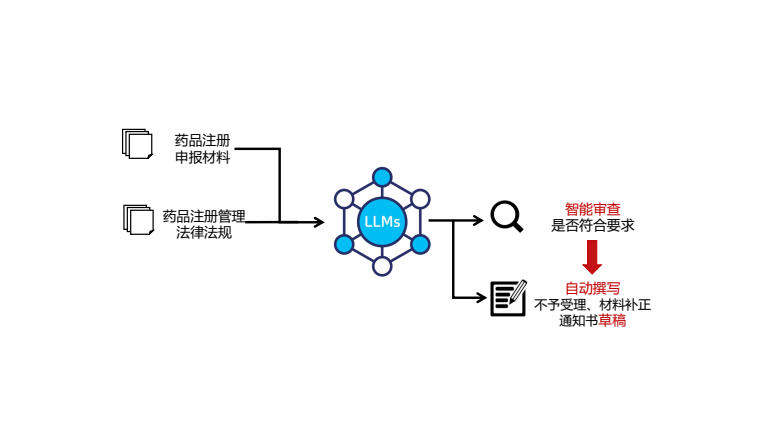 一、辅助审批 (一)形式审查 图1是形式审查场景中大语言模型(Large Language Model,LLM)应用示意图,其基于检索增强生成(Retrieval-Augmented Generation,RAG)技术架构,LLM实时检索药品监管法律法规外部知识库,对注册备案材料的完整性和内容一致性进行自动校验,以数字化技术手段完成合规性审查、数据真实性核验以及不符合项识别,并生成结构化审查意见,自动化输出不予受理或材料补正通知书草稿,提升形式审查工作效率。