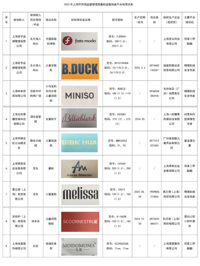 近日,上海市市场监管局通告9批次抽检不合格童鞋,涉及:标称上海荟众科技有限公司生产的“fata moda”卡通萌趣防滑拖;福建利森远泰贸易有限公司生产的“B.DUCK”儿童凉拖鞋;名创优品(广州)有限责任公司生产的“MINISO”小马宝莉系列天使儿童洞洞鞋;葛兰德(上海)商贸有限公司生产的“melissa”小童童鞋;上海晟骄服饰有限公司生产的“礼遇”玫瑰花单鞋等。