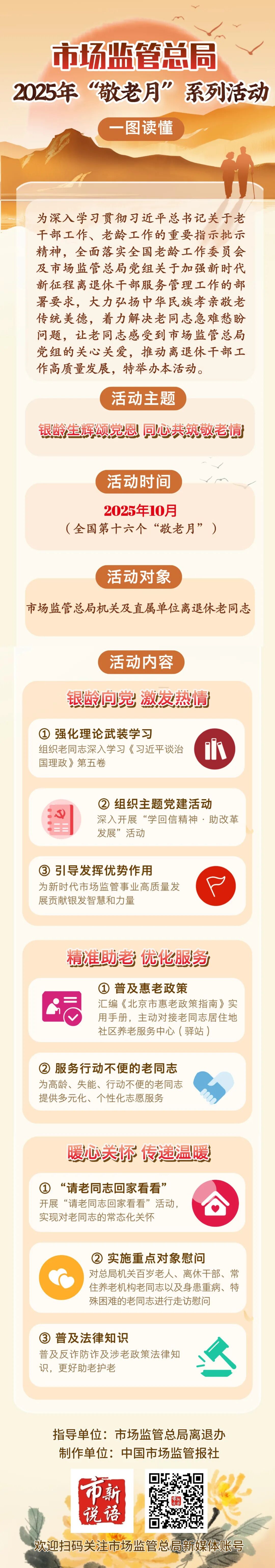 本次活动以“银龄生辉颂党恩 同心共筑敬老情”为主题,是市场监管总局贯彻落实全国老龄委“敬老月”活动部署、深化老干部服务保障工作的具体实践。活动聚焦精准服务与资源对接,着力提升老同志的获得感、幸福感和安全感,助力实现“老有所养、老有所医、老有所学、老有所乐、老有所为”的目标。