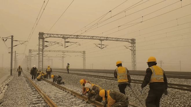 铺轨队工人施工中突遇沙尘暴,