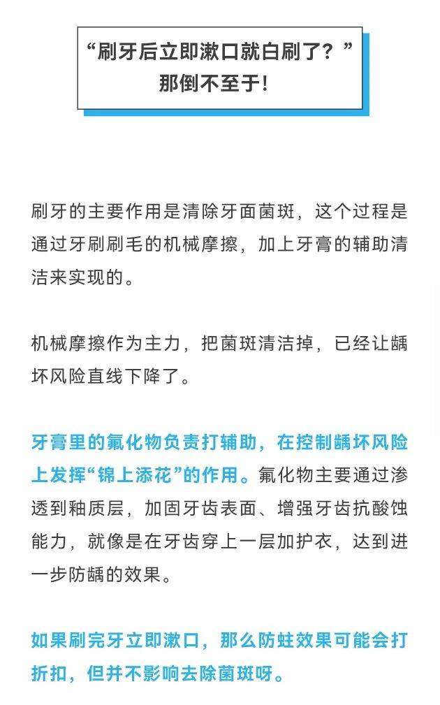 之所以说不要马上漱口,是因为牙膏中的有效防龋成分氟化物,在牙面上停留时间越长,渗透到牙釉质内的效果越好。(注:无氟牙膏不在本文讨论的范围内)