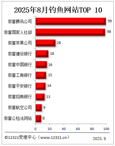 近日,12321受理中心发布数据显示,8月被投诉的钓鱼网站前十名为:假冒腾讯公司、假冒国家人社部、假冒苹果公司、假冒建设银行、假冒中国银行、假冒工商银行、假冒平安银行、假冒招商银行、假冒航空公司、假冒公检法网站。如果收到这些钓鱼诈骗网站发送的如“您的iPhone设备正在授权门店申请解锁,请通过×××查看详细位置并申请扣留”“您在我行的账户存在异常,前往×××认证信息”此类短信,不要打开其中的链接,不要泄露个人信息。