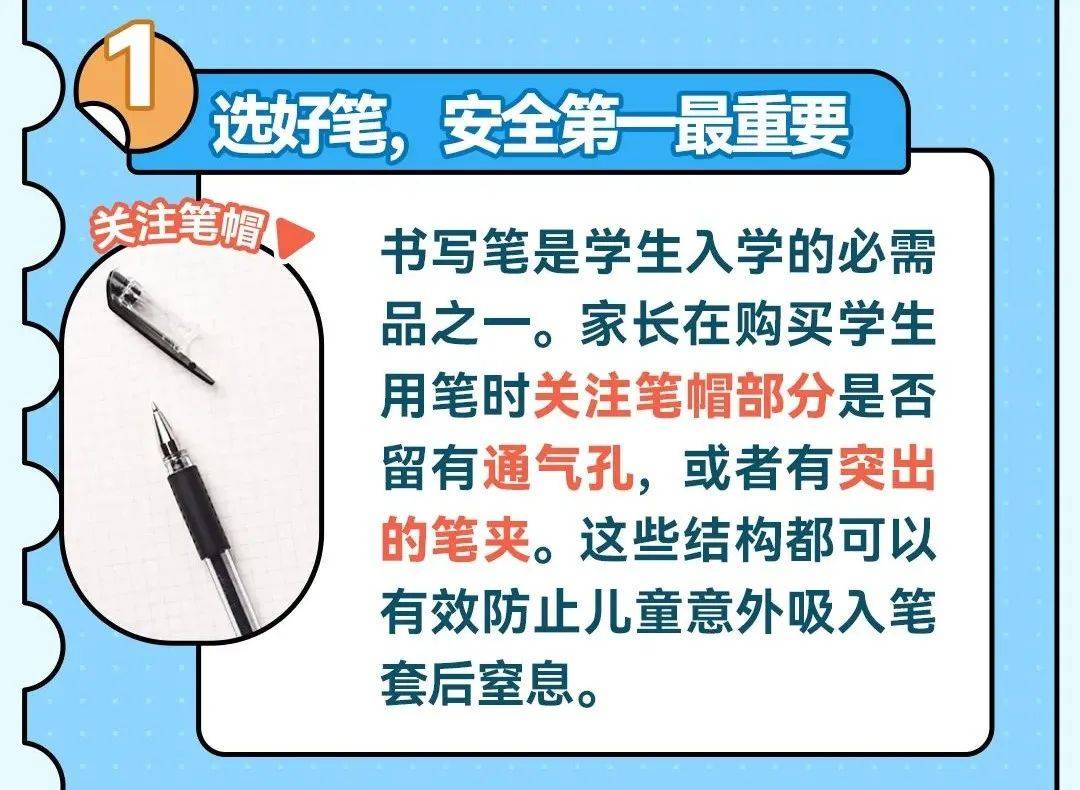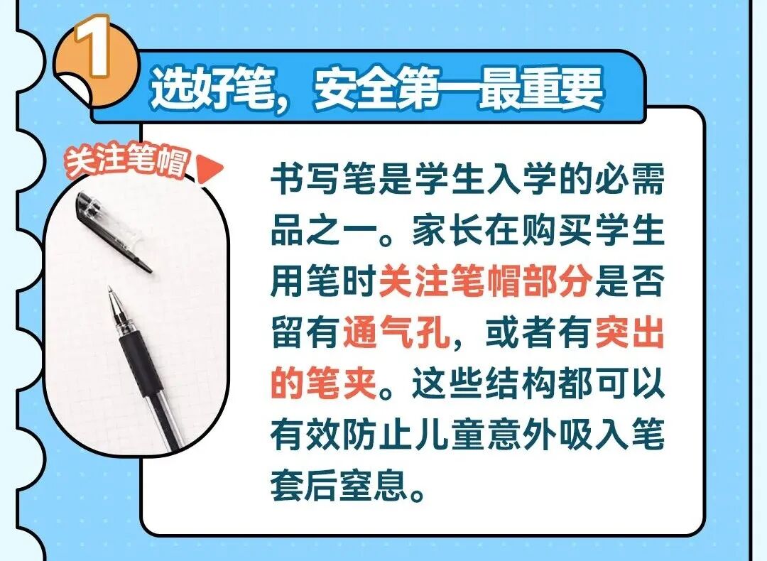 有些儿童笔的笔帽上或者尾端上,镶着晶莹剔透的小物件,让孩子们爱不释手,甚至还有笔帽是一个削笔刀……如果被孩子误吞,有可能就被固定在喉咙下而阻塞气管,带削笔刀的还可能伤害喉咙,非常危险。