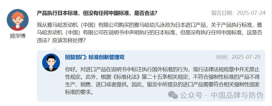 我从雅马哈发动机(中国)有限公司购买的雅马哈幼儿泳池为日本进口产品,关于产品执行标准,雅马哈发动机(中国)有限公司在说明书中声明执行的日本标准,但是没有执行任何中国标准,这是否违法?应该怎样处理?