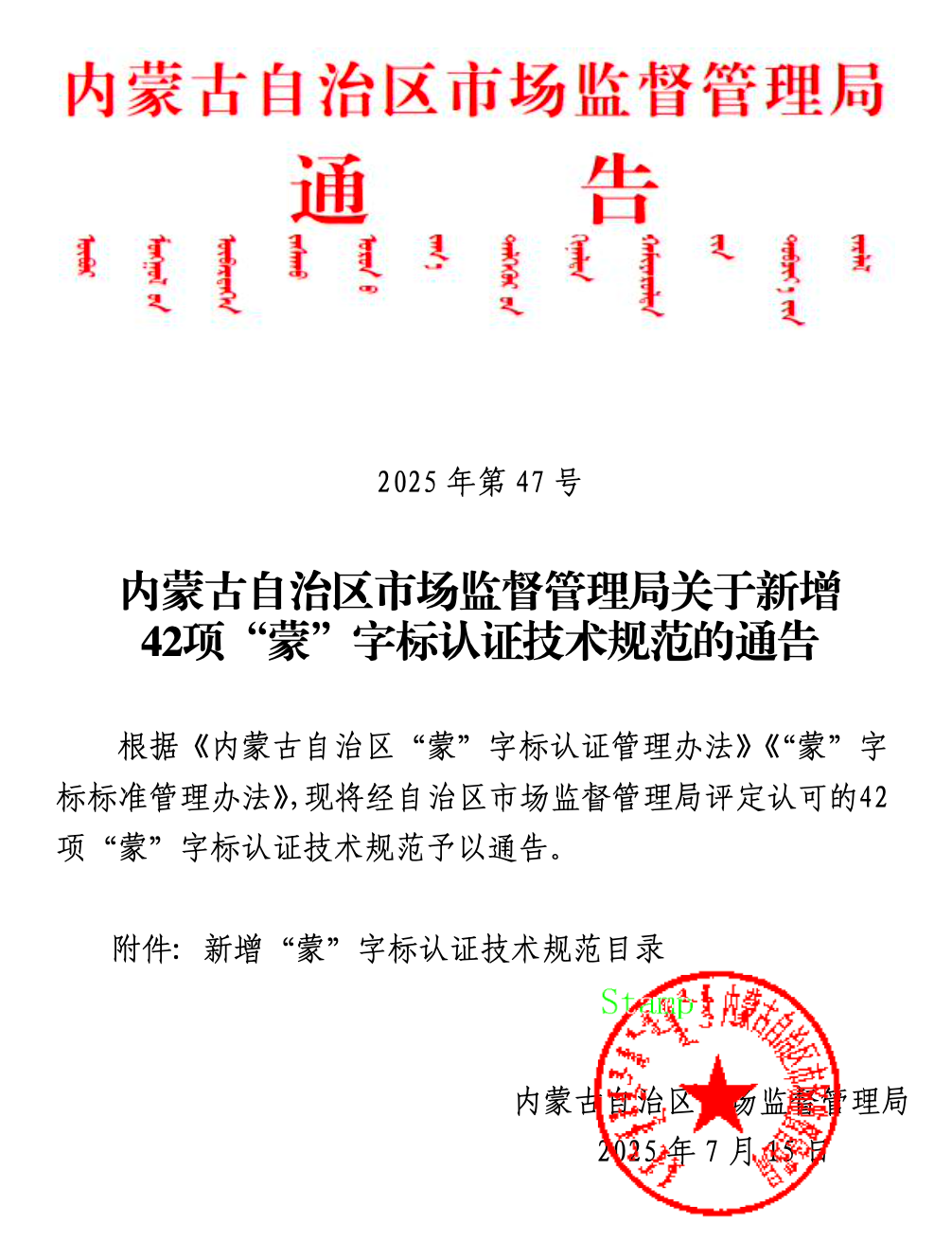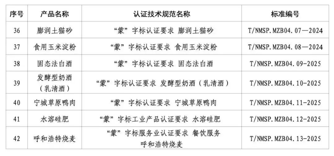 近日,内蒙古自治区市场监督管理局正式发布《关于新增42项“蒙”字标认证技术规范的通告》(2025年第47号)。通告显示,经自治区市场监督管理局严格评定,新增42项“蒙”字标认证技术规范,进一步丰富了内蒙古特色产品认证体系。