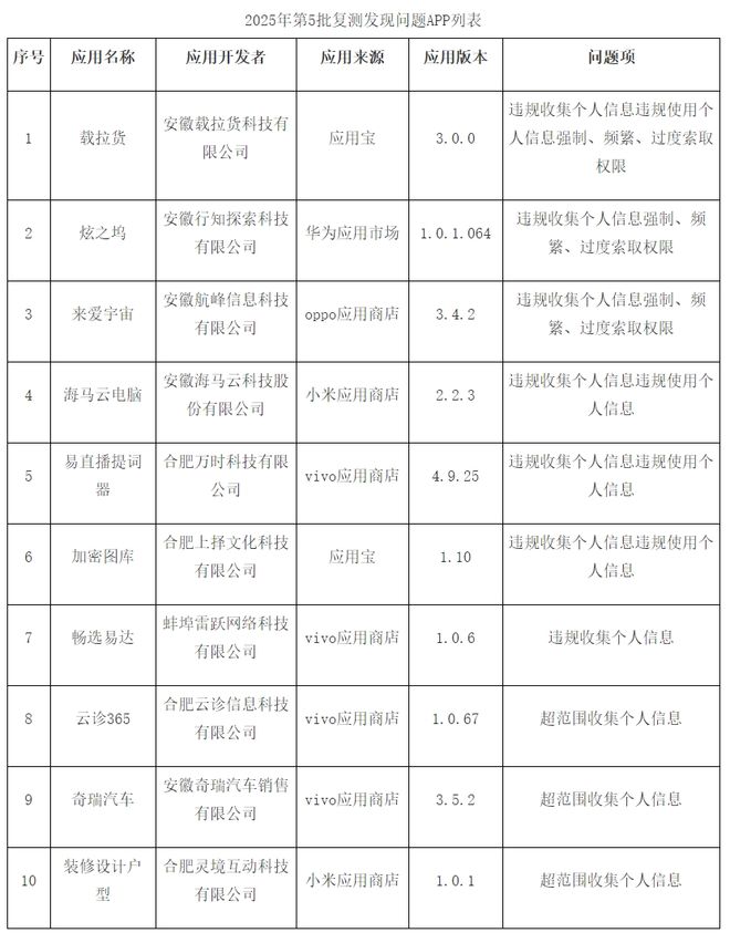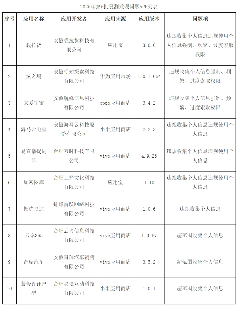 近日,安徽省通信管理局通报10款侵害用户权益的App,涉及:“载拉货”“炫之坞”“来爱宇宙”“海马云电脑”“易直播提词器”“加密图库”“畅选易达”“云诊365”“奇瑞汽车”“装修设计户型”。问题涉及违规收集个人信息;强制、频繁、过度索取权限等。