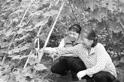 科技特派员(左)与种植户在广西贺州市八步区东融(供港)蔬菜产业核心示范区查看毛节瓜长势。谭小荣摄