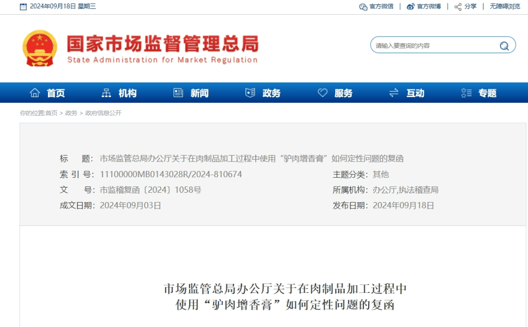 市场监管总局办公厅关于在肉制品加工过程中使用“驴肉增香膏”如何定性问题的复函