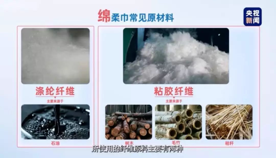 绵柔巾所使用的纤维原料主要有两种,一种是涤纶纤维,主要从石油中提取,另一种是粘胶纤维,其原料来源于树木、毛竹等。