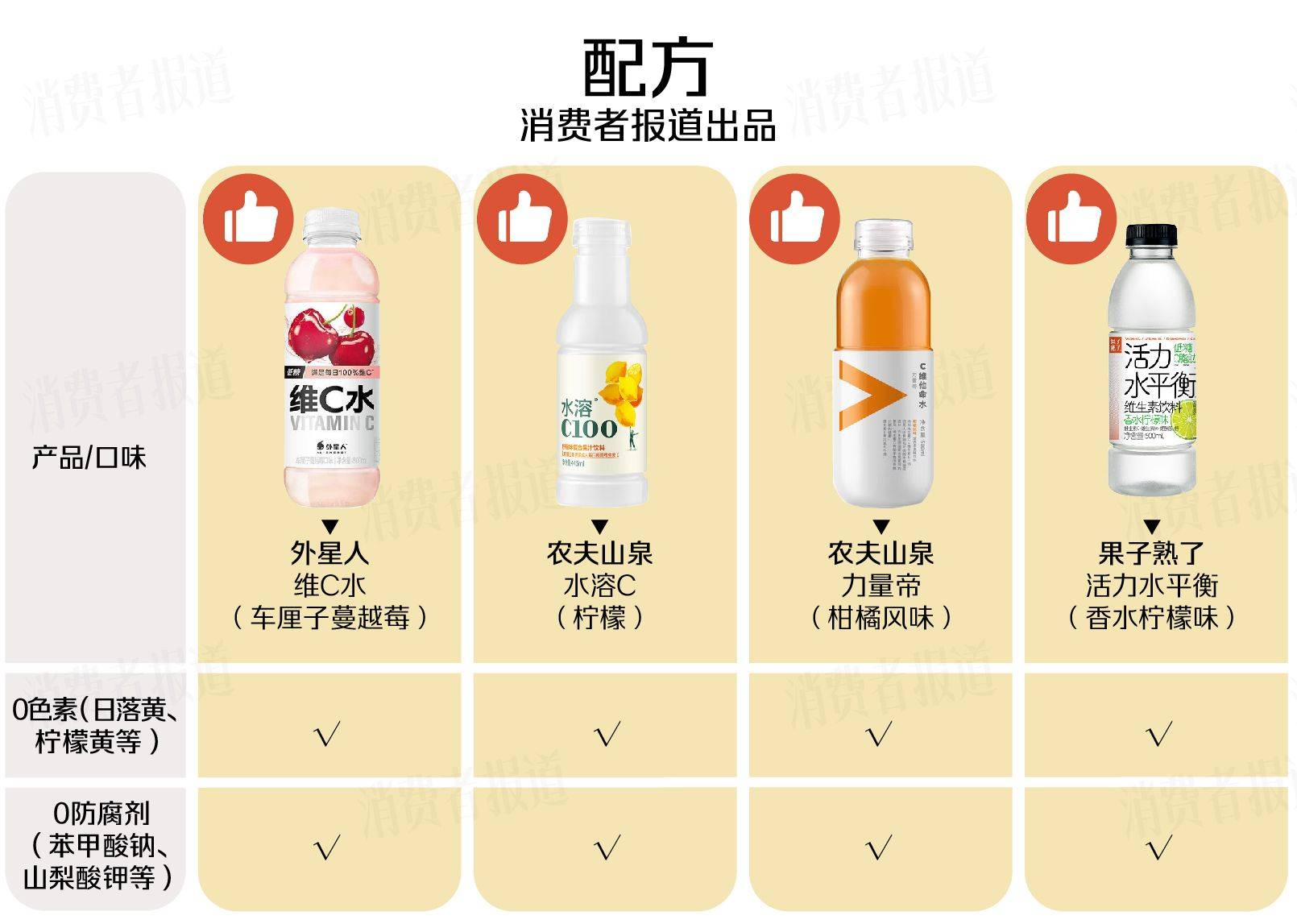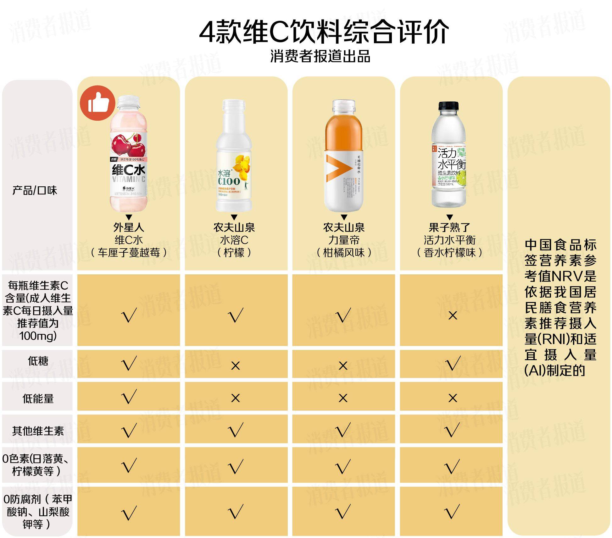 带着这个疑问,近日,我们对比分析了市面上4款主流维C饮料,包括外星人维C水、农夫山泉(水溶C100)、农夫山泉(力量帝)、果子熟了,从维生素C含量、糖分、能量、添加剂等多维度进行对比分析,并结合《中国居民膳食营养素参考摄入量》、中国《食物成分表》等进行分析和推荐。