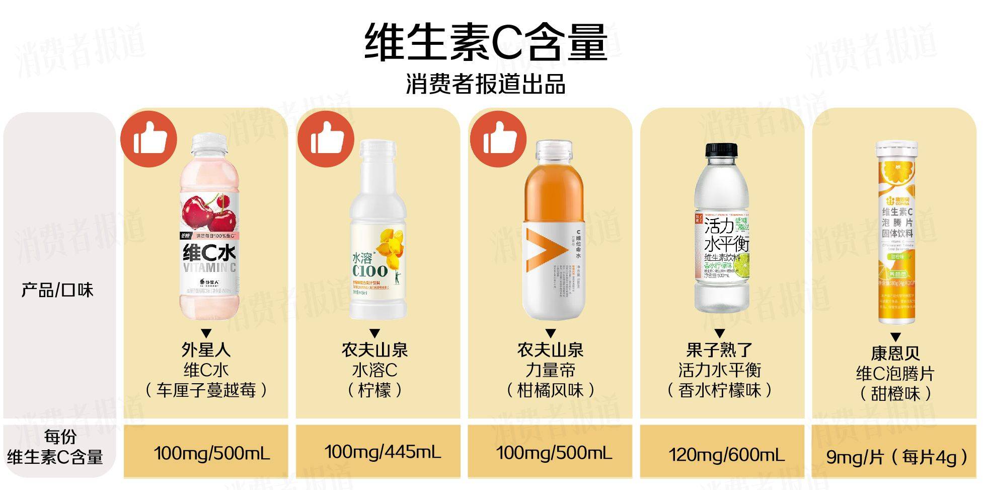 1. 外星人、农夫山泉等3款维生素C含量较合理