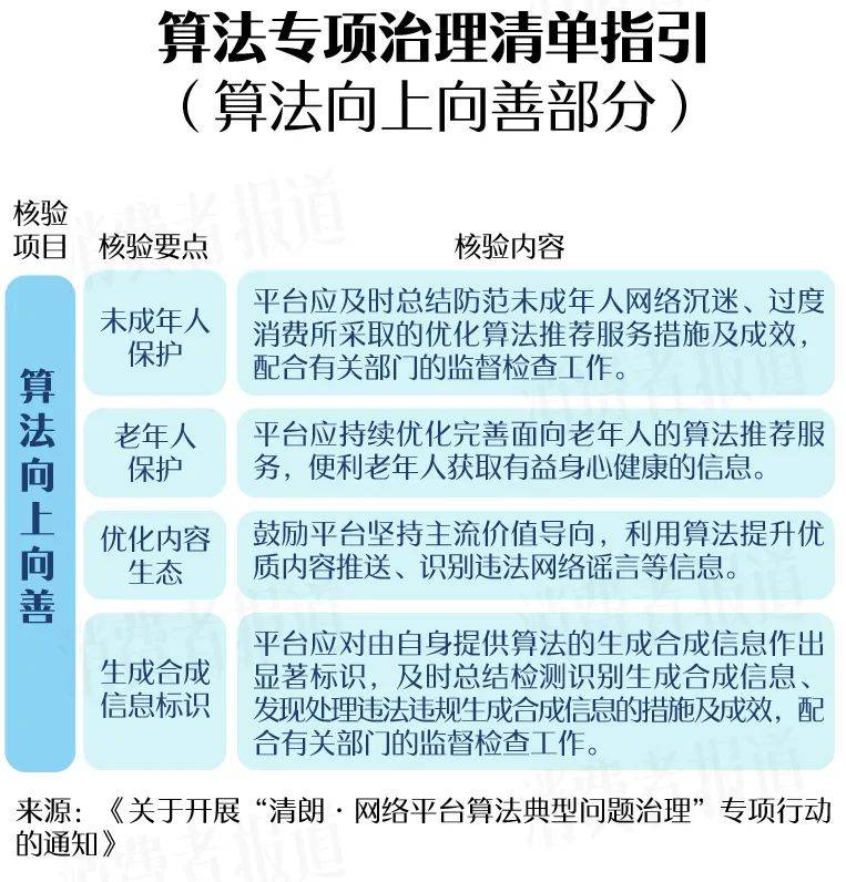 为进一步深化互联网信息服务算法综合治理,中央网信办、工信部、公安部、国家市场监管总局等四部门于2024年11月联合发布了《关于开展“清朗·网络平台算法典型问题治理”专项行动的通知》,明确了信息茧房、热搜榜单、新就业形态劳动者权益、大数据“杀熟”、算法向上向善、落实算法安全主体责任等六大整治任务,督促企业深入对照自查自改,进一步提升算法安全能力。通知同时明确了算法导向正确、算法公平公正、算法公开透明、算法自主可控、算法责任落实等工作目标。