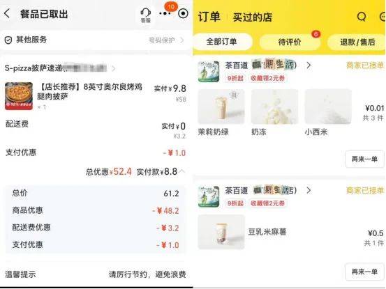在三家平台的“外卖大战”下,大量消费者在社交平台上晒出其外卖订单,如一分钱喝奶茶、8.8元吃披萨等。