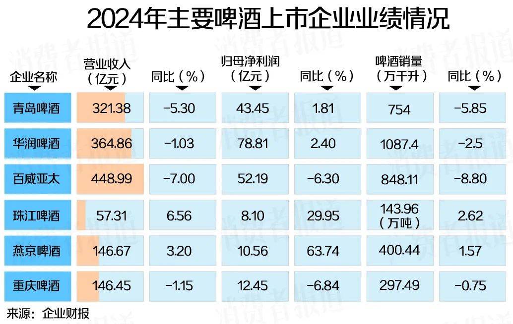 财报显示,2024年华润啤酒、百威亚太、青岛啤酒、重庆啤酒分别实现营业收入364.86亿元(啤酒业务)、62.44亿美元(折合人民币448.99亿元)、321.38亿元、146.45亿元,同比下滑1.03%、7.00%、5.30%、1.15%。其中,百威亚太与重庆啤酒更是出现了营收与净利润的双下滑。