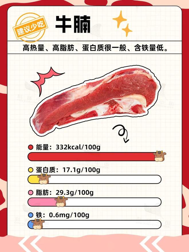 ✨按照“营养普通,但确实好吃”的标准,建议少吃:牛上脑、牛胸肉、牛肩肉、牛腩。