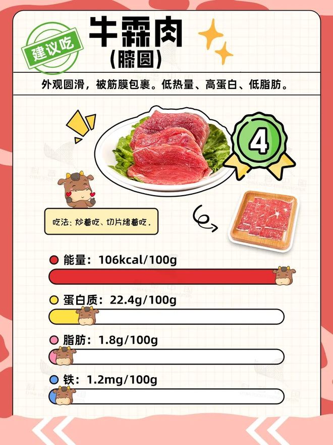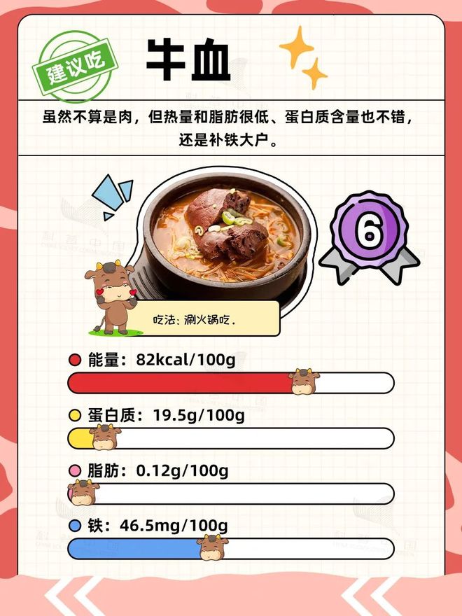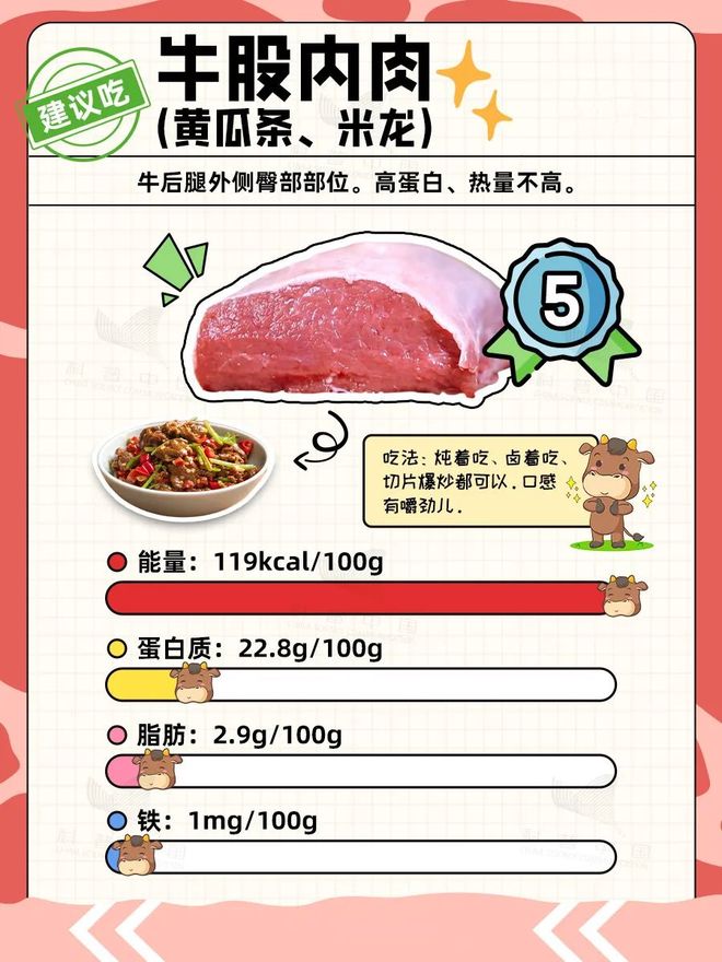 ✨按照“营养高,口感好”的标准,建议吃:牛腱子、牛里脊、牛腿肉、牛霖肉、牛股内肉(黄瓜条)、牛血。