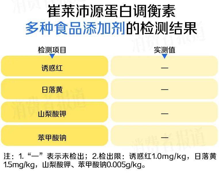 本刊对消费者关注度较高的2种主流防腐剂(山梨酸钾、苯甲酸钠),产品中可能添加的2种合成色素(诱惑红、日落黄)进行了检测。结果显示,纽崔莱沛原蛋白调衡素均未检出4种有争议的食品添加剂,配方更纯净,食用更安心。