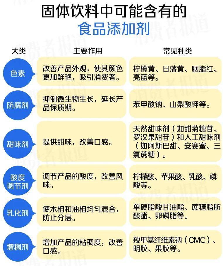 出于口感、外观、保质期和稳定性的需求,固体饮料中常见的食品添加剂主要包括色素、防腐剂、甜味剂、酸度调节剂等。