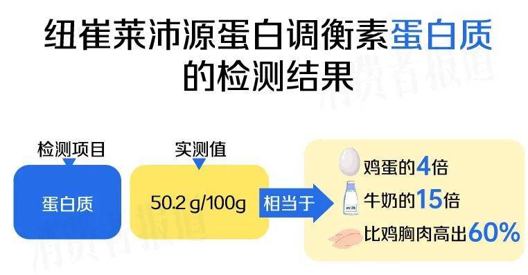 检测结果显示,纽崔莱沛原蛋白调衡素蛋白质含量的实测值为50.2g/100g,若以常见的高蛋白食物对比,相当于鸡蛋的4倍、牛奶的15倍,比健身增肌人士青睐有加的鸡胸肉高出60%,非常适合有代谢紊乱需要高效补充蛋白质的人群。