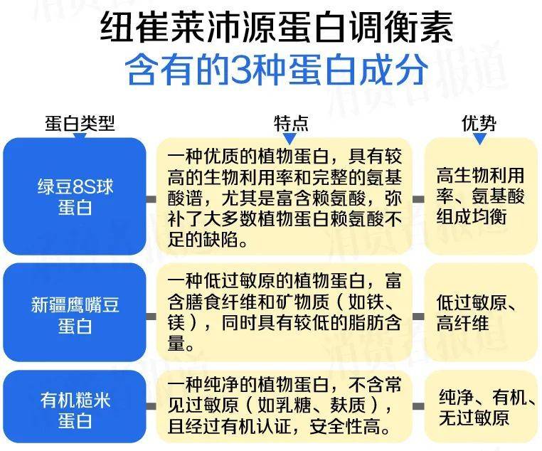 除了“量”,蛋白质的“质”同样很重要。普通蛋白粉一般是大豆蛋白、豌豆蛋白、乳清蛋白、酪蛋白等常见来源。从配料信息可知,纽崔莱沛原蛋白调衡素采用的是三重植物蛋白配方——绿豆8S球蛋白、新疆鹰嘴豆蛋白、有机糙米蛋白,来头都不小。其中绿豆8S球蛋白生物利用率高,新疆鹰嘴豆蛋白是低过敏原的植物蛋白,有机糙米蛋白经有机认证安全性更高,三重植物蛋白科学配比,氨基酸互补,营养更全面。