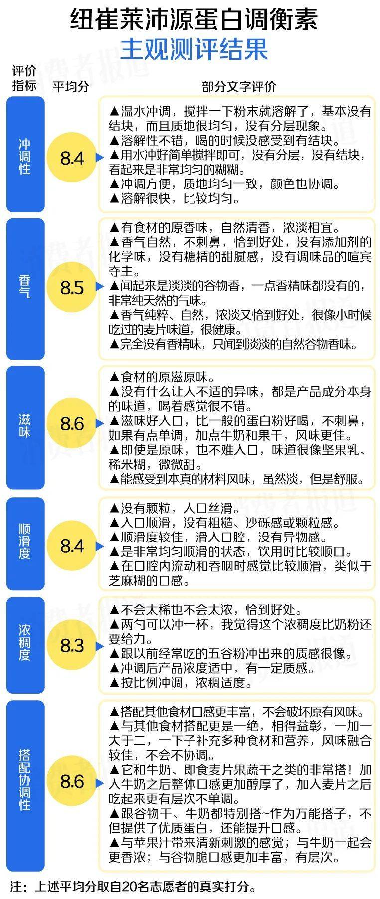 对此,《消费者报道》招募了20名有丰富测评经验的志愿者对纽崔莱沛原蛋白调衡素进行了全方位的试喝体验。