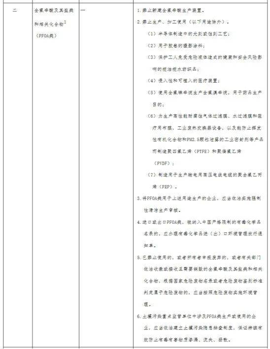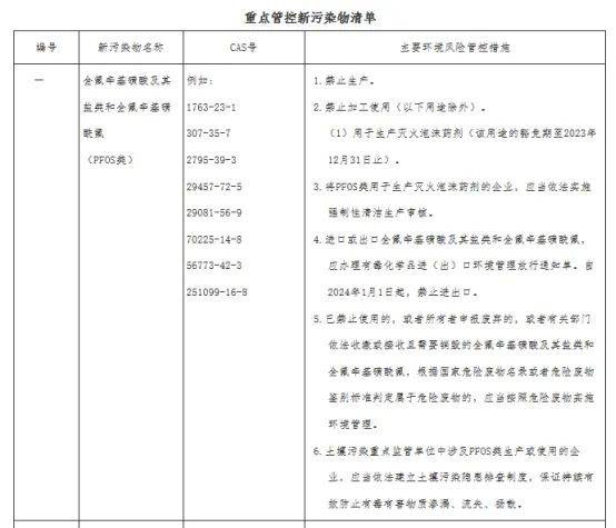2023年,PFOS类和PFOA类被列入国家重点管控新污染物清单,除特殊用途外,禁止加工使用。管控措施中还包括:土壤污染重点监管单位中涉及PFOS类PFOA类生产或使用的企业,应当依法建立土壤污染隐患排查制度,保证持续有效防止有毒有害物质渗漏、流失、扬散。