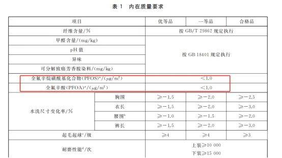 实际上,国家标准对冲锋衣上的两种PFAS类物质有严格要求。GB/T 32614-2023《户外运动服装 冲锋衣》规定,优等品、一等品、合格品冲锋衣,其PFOS和PFOA的限值要求均为<1.0(μg/m²)。值得一提的是,PFOA和PFOS是PFAS组中使用和研究最广泛的两种化学品。