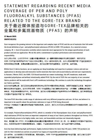 对于GORE-TEX面料中含有PFAS的争议话题,戈尔公司在3月27日发出声明称,认识到公众对于PFAS的关注度日益提升。公司始终审慎选择最合适的材料,遵循“立足环保,追求性能”的品牌理念。