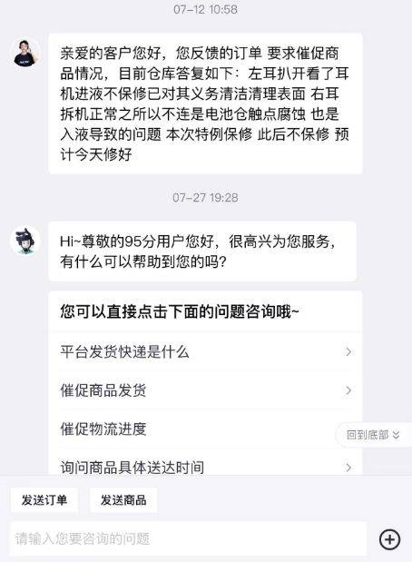 由于耳机在95分平台的质保期为365天,他选择了返修。据他讲述,第一次返修耽误了将近半个月时间,不了解维修进度的他需要反复致电催促95分客服。“返修后,耳机的耗电问题非但没有被解决,而且过了一段时间完全不能使用。”