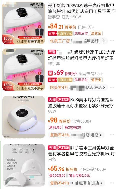 据了解,上海市消保委在上述评测中提及的美甲灯,均购自电商平台。《消费者报道》记者在电商平台搜索到该次评测的同款美甲灯,热销款的销量最高达8万多。(注:上海市消保委未公布检测不合格的品牌,以下产品不代表有问题)
