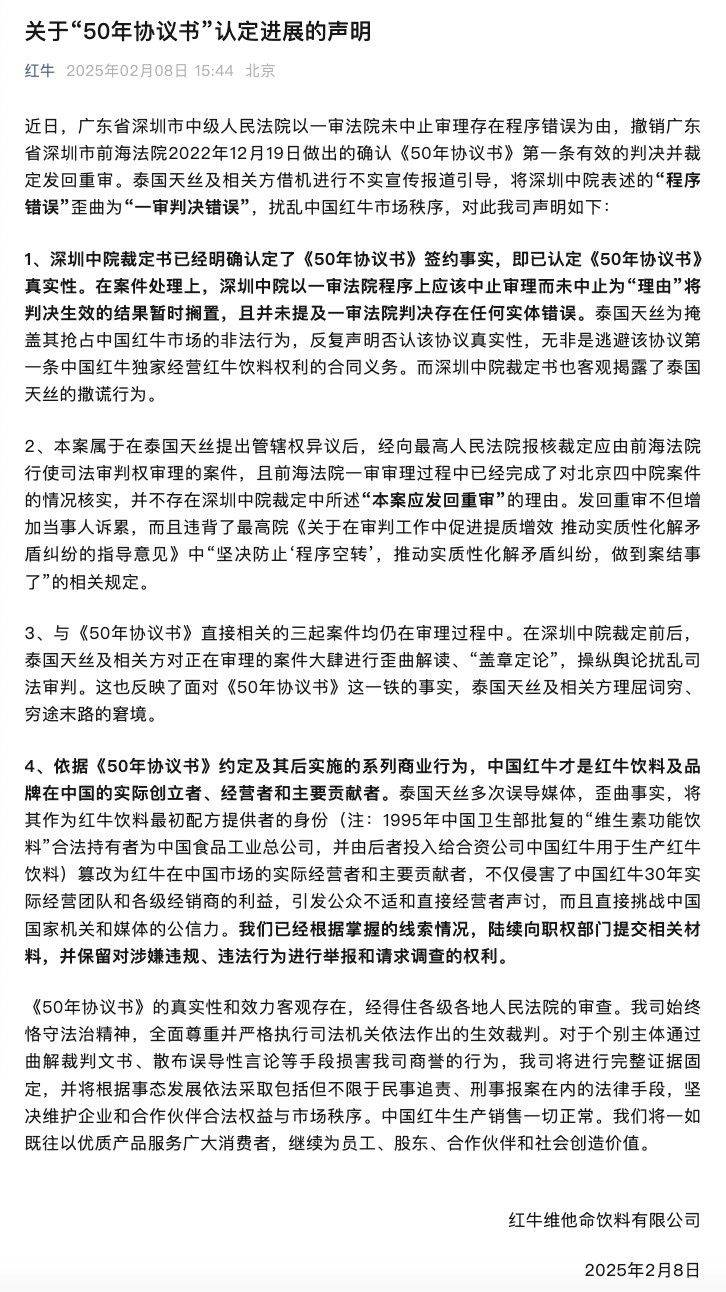 2月8日下午,华彬集团通过“红牛”微信公众号发布声明称,广东省深圳市中级人民法院以一审法院未中止审理存在程序错误为由,撤销广东省深圳市前海法院2022年12月19日做出的确认《50年协议书》第一条有效的判决并裁定发回重审。