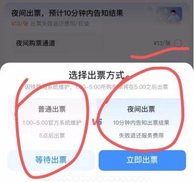据悉,铁路12306每日05:00至次日01:00(周二为5:00至24:00)提供购票、改签、变更到站业务办理,全天均可办理退票等其他服务。而谢婷在平台下单时正值深夜,当时订单页面有一行小字显示出“夜间购票通道”选项,且标注需要额外支付13元/张的费用。据谢婷回忆,在支付页面上,她并未主动勾选“夜间购票通道”,但在付款时,页面突然弹出一个加深蓝色的“立即出票”弹窗选项。