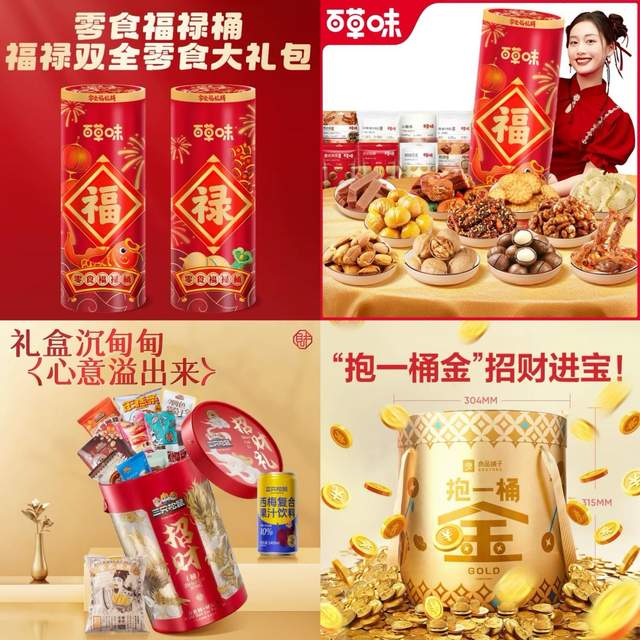 随着消费趋势的变化,众多品牌在传承经典口味的基础上,对产品的包装进行了大胆的创新。近几年以来,大桶装的年货礼盒备受欢迎,这些礼盒不仅承载着节日的祝福,还展现了创意与心意。《消费者报道》记者观察发现,一大波品牌的零食礼盒也火力全开。例如,良品铺子推出了相关桶装巨型零食,如“抱一桶金”“零食全家桶”“富竹连连节节高”,百草味推出“福禄桶”“财源滚滚”,三只松鼠推出“招财桶”“发财桶”,乐事推出“福乐桶”“全家桶”……这些年货的桶装礼盒内含有品牌多款经典产品组合,以满足不同消费者的多元需求。