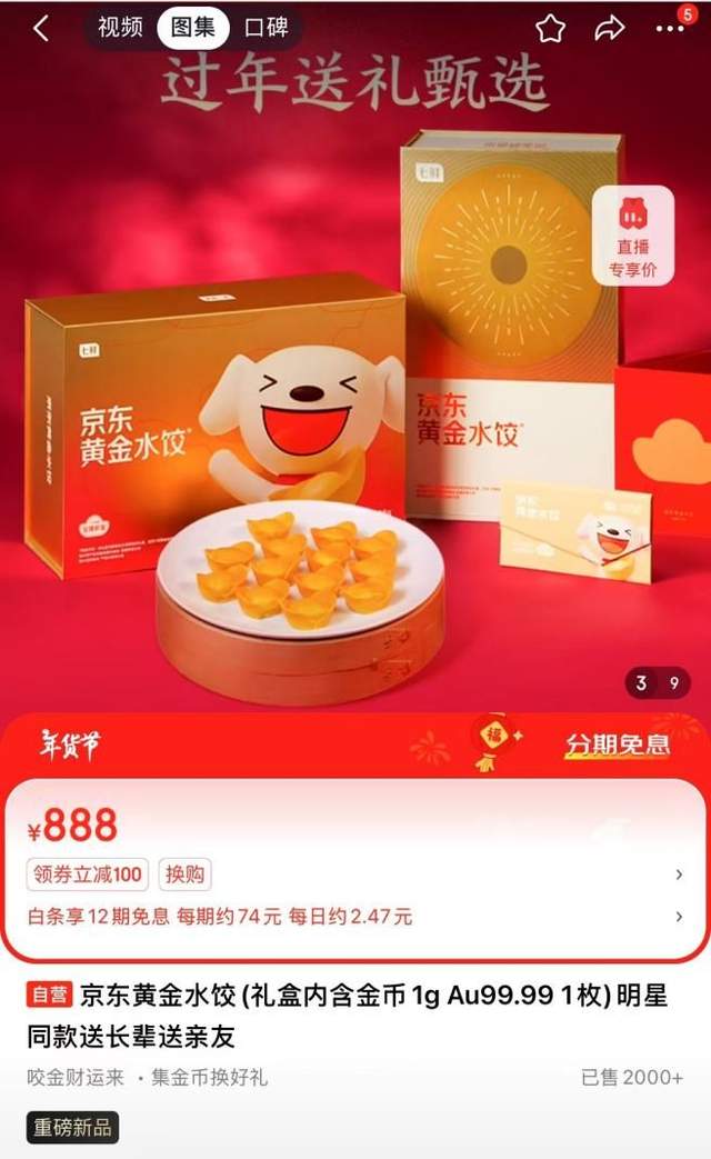 据悉,这枚“黄金饺”内藏有一枚生肖金币,金币材质为Au99.99,由中国黄金打造。该黄金水饺设置了两个不同的价格档次,其中一款礼盒内含1枚1g重生肖金币,售价888元;另一款礼盒内含1枚5g重生肖金币,售价3888元。截至发稿,在京东APP上,价值3888元黄金水饺礼盒售出500多件,888元礼盒售出超过2000件。