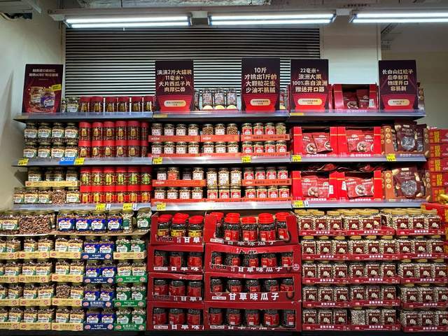 在沃尔玛超市里,设置了多个年货堆头,其年货礼盒主要以三只松鼠、百草味、徐福记、盐津铺子、乐事、洽洽、沃隆、江中猴姑等知名品牌为主。