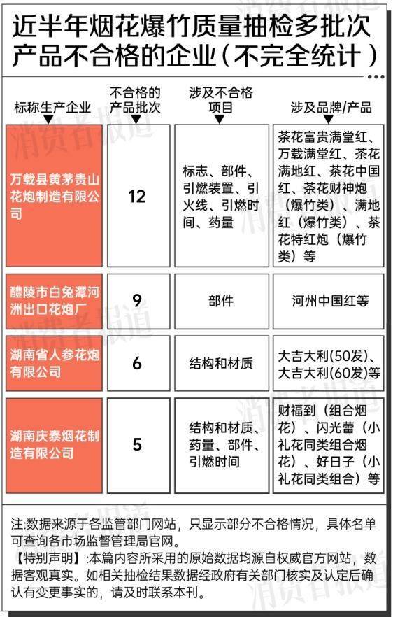《消费者报道》记者留意到,上述表格中,标称生产企业为湖南庆泰烟花制造有限公司的产品,在近半年来被检出5批次不合格,涉及的不合格项目包括结构和材质、药量、部件、引燃时间。具体不合格的品牌/产品有财福到(组合烟花)、 闪光蕾(小礼花同类组合烟花)、好日子(小礼花同类组合)等。